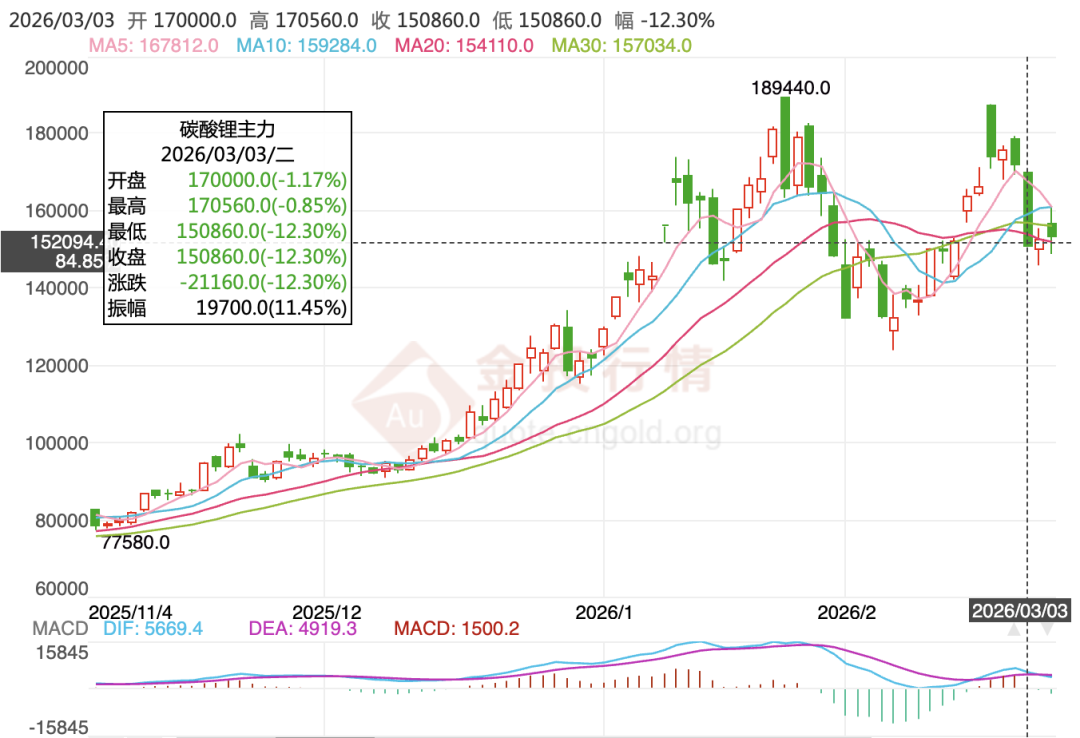 次日,碳酸锂期货主力合约触及跌停,跌幅12.3%,收盘报150860元/吨。受此影响,锂矿股全线大幅下挫,赣锋锂业H股(01772)当日跌幅超10%,天齐锂业H股(09696)跌逾8%。