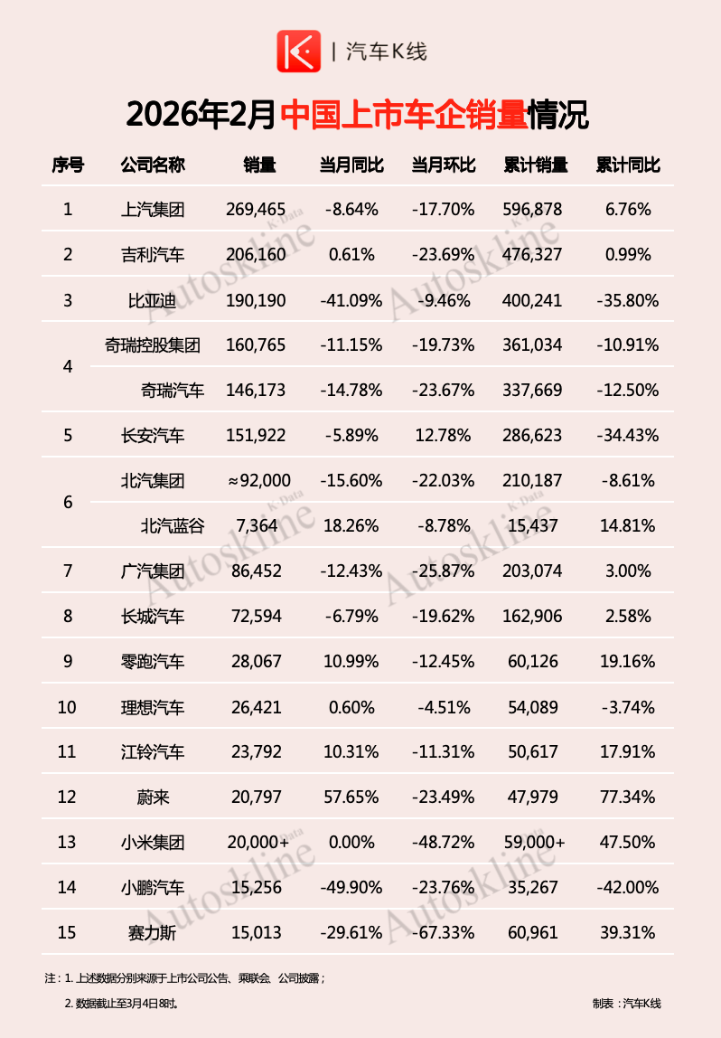 海通国际在最新研报中指出,2月车企销量在春节扰动与消费节奏切换下普遍承压,但结构分化已现,部分企业依靠海外放量、主力车型支撑表现稳健。
