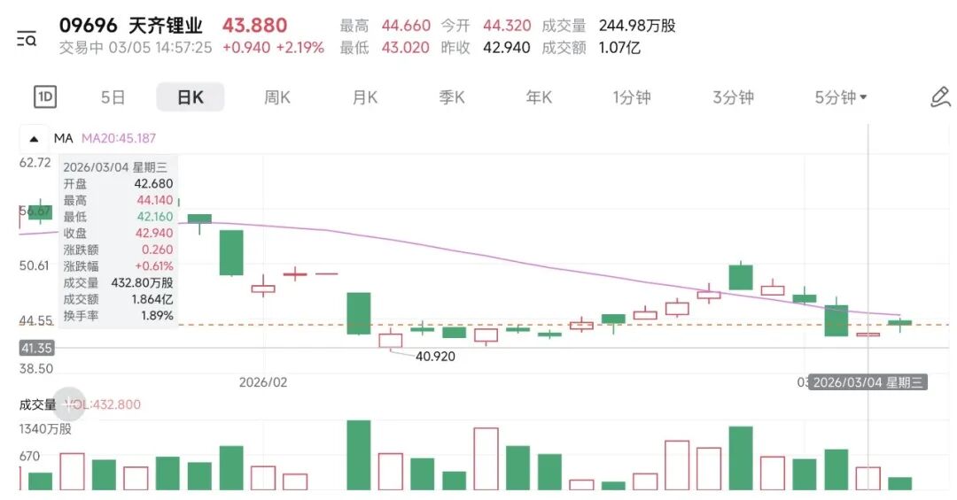天齐锂业A股(002466)表现更为亮眼,3月4日录得近1%上涨,成为当日少数录得上涨的A股汽车股。