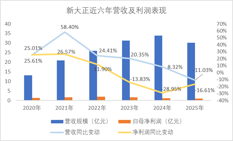 自2022年开始,新大正营收、利润增速开始出现下降;2023年,自上市以来首次录得利润同比下降;2025年,营收、利润均呈现负增长状态,其中利润出现三连降表现。