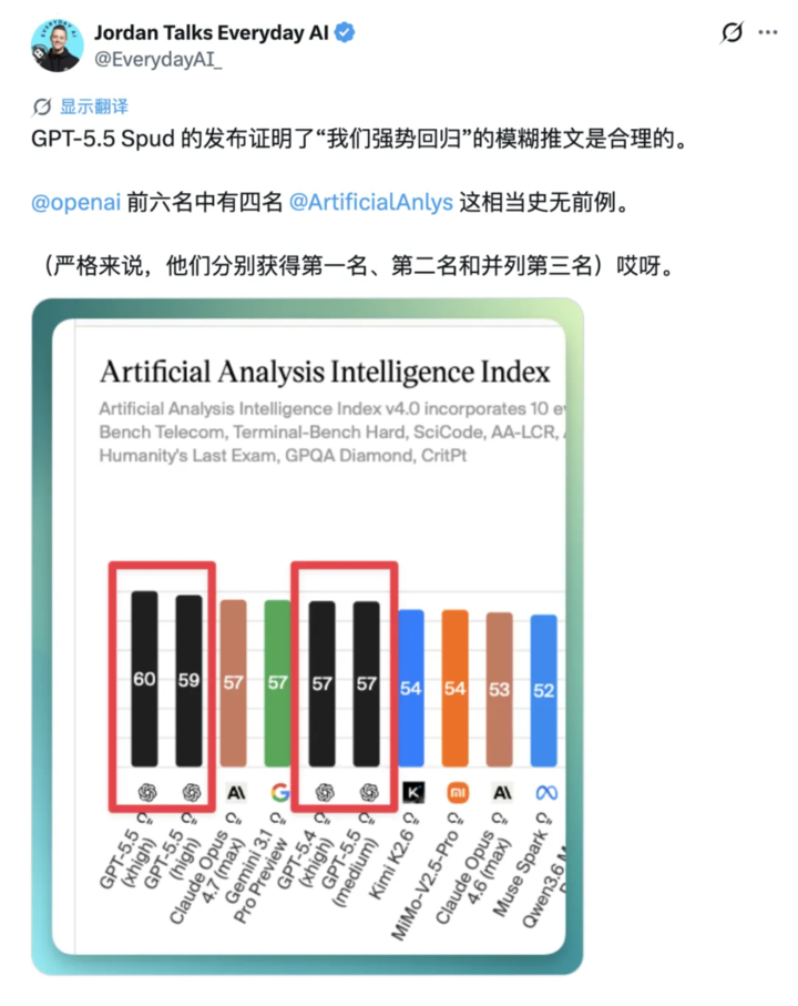在知名第三方评测机构 Artificial Analysis 的综合智能指数榜单上,OpenAI 凭借 GPT-5.5 系列拿下了第一名和第二名,前六席中包揽了四席,竞争对手几乎毫无招架之力。