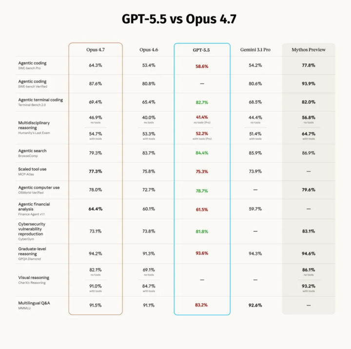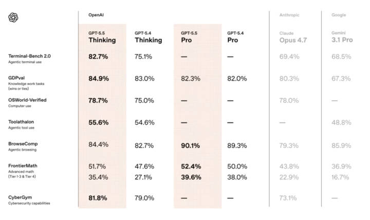 基准测试结果显示,在 Terminal-Bench 2.0(测试复杂命令行工作流)上,GPT-5.5 达到 82.7%,GPT-5.4 为 75.1%,Claude Opus 4.7 为 69.4%。