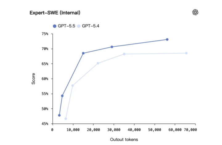 在 OpenAI 内部的 Expert-SWE 评测上,任务的人类预计完成时间中位数为 20 小时,GPT-5.5 达到 73.1%,GPT-5.4 为 68.5%。且在三项评测上,GPT-5.5 均以更少 token 完成任务。