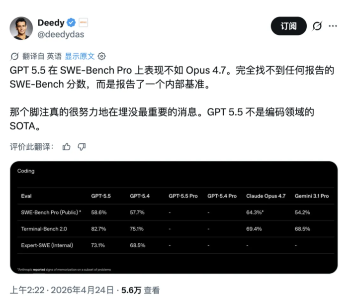 只不过,OpenAI 这次也玩起了脚注里的小心思,用一行小字暗戳戳质疑 Claude Opus 4.7 部分成绩的可信度。但网友 Deedy 对此并不买账,在他看来,这行备注更像是转移注意力 —— 毕竟 OpenAI 自己也没能拿出一套更透明的公开基准,正面佐证 GPT-5.5 的实力。